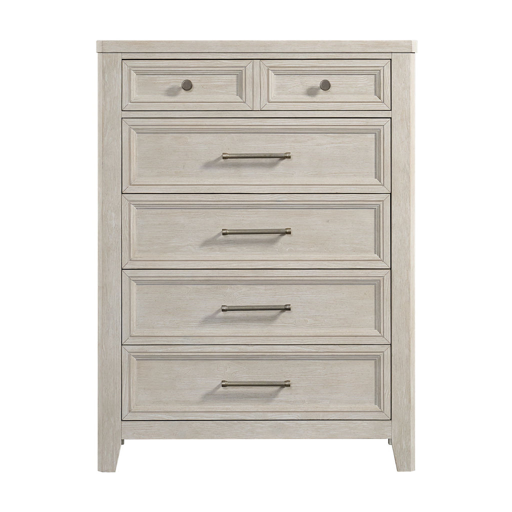 Carlson Bedroom offers transitional style blended with the casual nature of lightly wire brushed spruce solids and veneer. This larger scale group features thick solid wood tops, chamfered front posts, framed drawer, and door accents in a comfortable Washed Linen finish. The hefty bar pull hardware features a stylish antique pewter finish, to beautifully round out this collection.