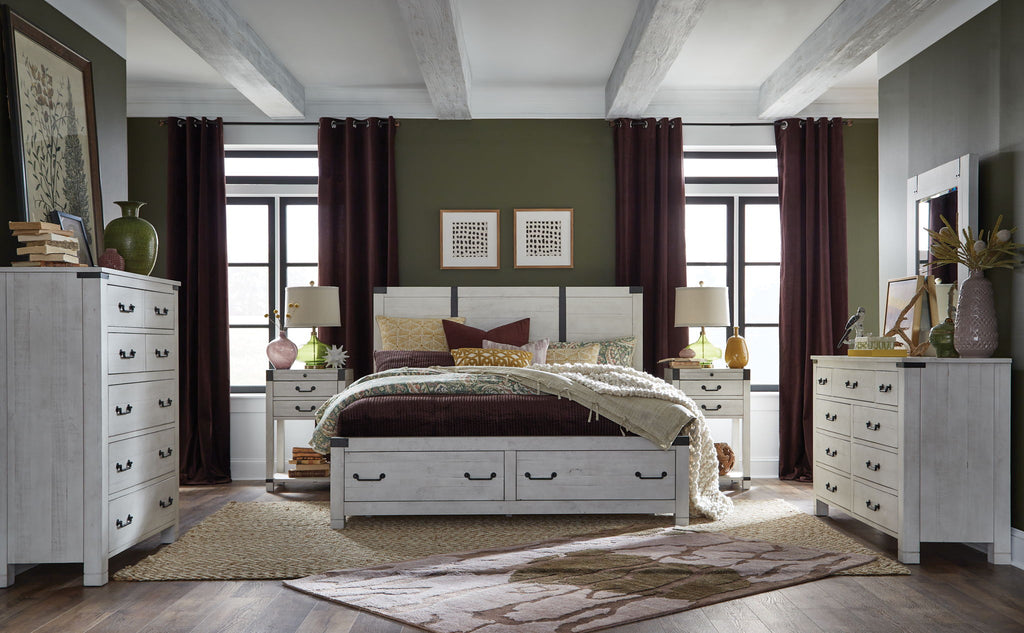 Is the perfect marriage of rustic charm and industrial edge and the sophisticated Chesters Mill Bedroom Collection would work in a loft in the mountains and in a home in the suburbs. The bright Alabaster finish on each frame — constructed of pine solids — is complemented by Aged Iron hardware for a look that’s modern and refined. Nine bed options are available in this collection and including three sizes of a knockout poster bed with an open canopy and as well as three sizes of a panel bed with optional storage underneath. The panel beds feature handcrafted metal detailing and providing additional handsome detail. Casegood pieces and including chests and nightstands and a dresser and a mirror and echo the industrial design with fresh forms highlighted with large bale pulls. A highlight is the unique Door Chest with sliding door and reminiscent of an old warehouse or barn and which is complete with two shelves and six drawers and wire management capabilities. The nightstand options — one open with two drawers and a pull-out shelf on the top and and one closed with three drawers — both feature on/off touch lighting control and wire management. This collection is also available in a warm Rustic Pine as well as a Weathered Charcoal finish and providing even more design options. Choose Chesters Mill for a modern and light industrial look and watch your space be transformed.