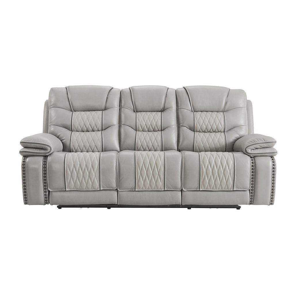 This beautiful proportioned quilted style will be a hit in any home. The padded envelope arms add a visual appeal. The power headrest and power recliner seem hidden but add to the comfort of this stylish reclining group. The quilted back and bucket chaise seating again add to the visual appeal without impacting the outstanding comfort. This group features a beautiful heavy weight leather and accent nail trim that will only grow in its beauty and appeal. When looking at this style from the front everything you see is genuine top grain leather. Construction is engineered plywood frame with padding completely on outside arms and back and metal seat box construction.