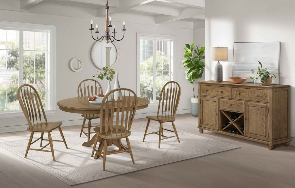 Constructed of Solid Oak. Transitional Country style. The Weathered Chestnut finish gives the group a relaxed feel. The hardware has an antique brass finish.