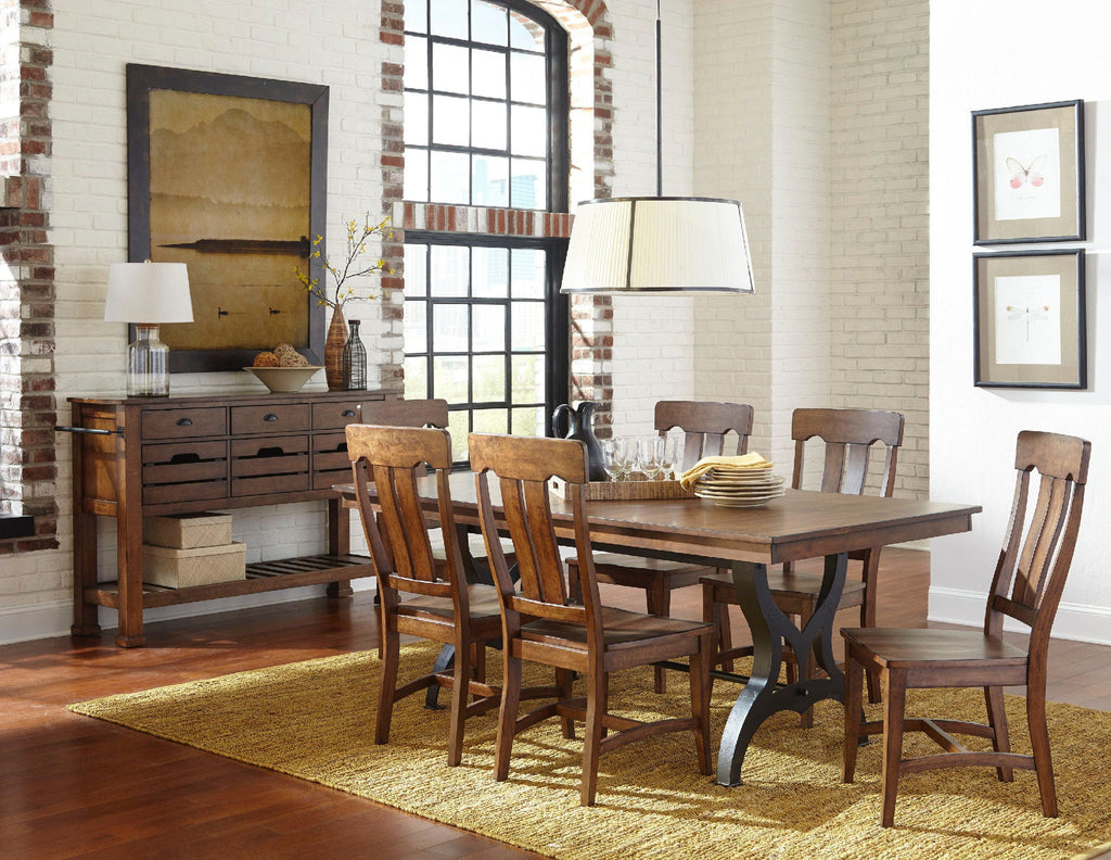 Industrial styling with cast metal accents and beautiful hardwood. The District pieces include one dining and one counter height table, dining chair and bench, counter height stool and functional sideboard. Unique designs can be seen throughout the group including table legs fashioned after an antique sewing machine. Comfortable curved back chairs and stools will invite your guests to stay just a little bit longer!