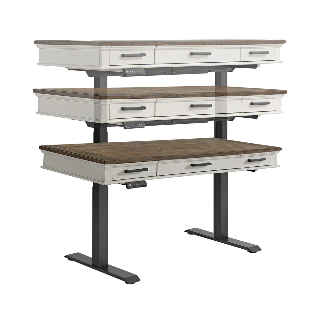 Drake Home Office offers a classic old world style, all case pieces have rustic oak plank board tops. This two-toned finish combines a relaxed antiqued gray finish with warm rustic oak patina. Solidly constructed and designed to function the way we work today.