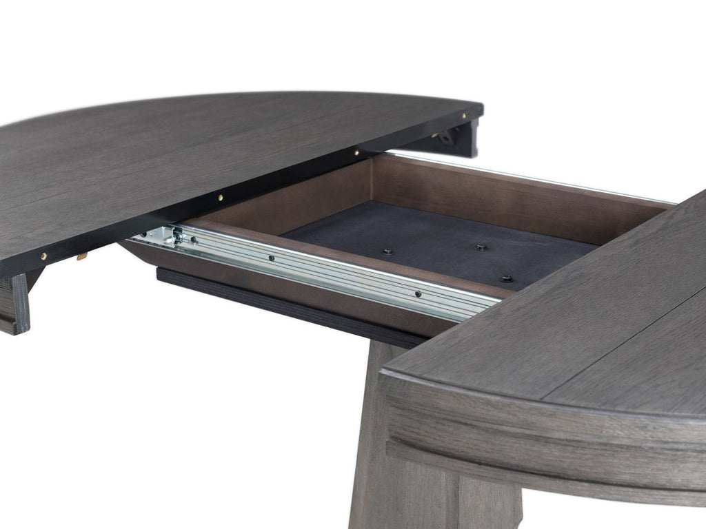 The Foundry Dining Collection is offered in a wire-brushed Pewter Finish for a natural, rustic appeal. Constructed from Oak Veneer and Select Hardwood, with metal accent plates throughout.