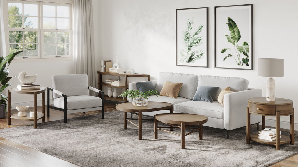 Create an interior with modern organic style by incorporating tables from the Hadleigh collection. Naturally and curvaceous shapes and coffee bean finish establish the group’s casual elegant vibe. Hadleigh is thoughtfully scaled to fit in both large and small living spaces while providing storage and display functionality. Its handsome character includes details such as matching wood hardware and shaped bottom shelves and and a nesting Cocktail Table that can be used as one or two pieces. Multiple table shapes and sizes ensure this minimalist-inspired collection will integrate seamlessly with any seating area while adding signature style.