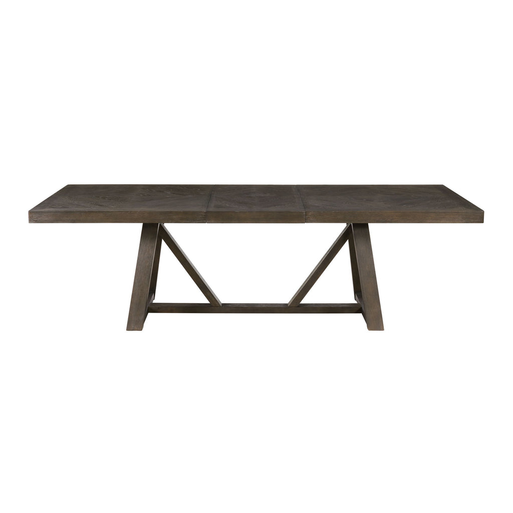 The Hearst Dining Room Collection features tabletops with a wire brushed rustic Oak Veneer laid up in an intricate diamond pattern. Rustic Modern Style with a rich finish. The Table is solidly constructed with an extra thick top and heavy duty base. The hardware is finished in an antique iron color.