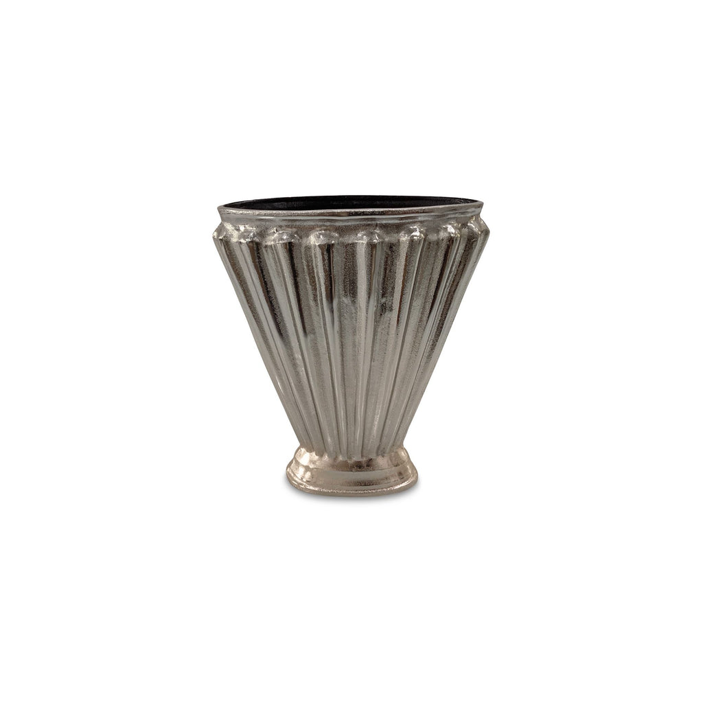 A fan favorite with scallops ready to show off. Jade turns a classic shape into a statement piece. Cast in aged pewter aluminum, its scalloped fan silhouette and Deco-inspired channeling create an eye-catching play of light and shadow. The elongated opening suits bold arrangements or holds its own just fine. Sculptural, elegant, and unapologetically ornamental, it’s a vase with presence and just a little sparkle.