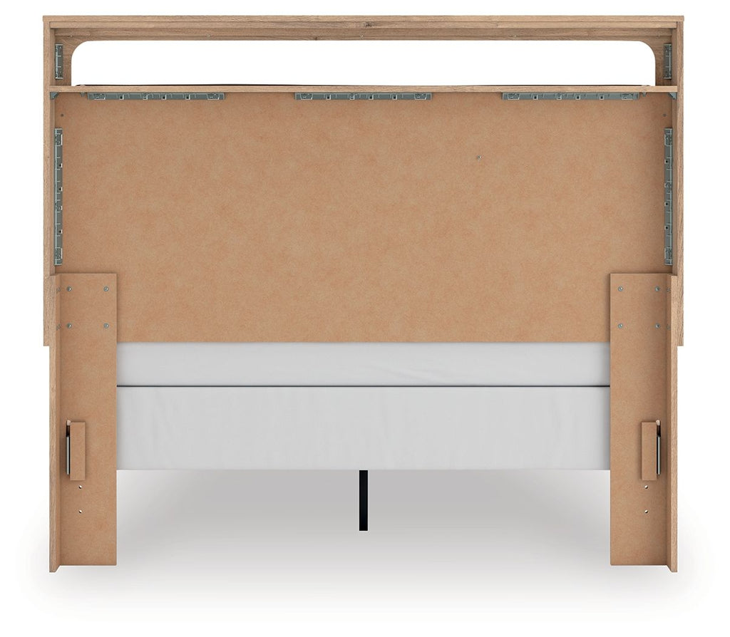 The natural wood tones and clean lines of this queen upholstered panel bed echo your easygoing style sensibilities. With a warm finish and replicated oak grain, its carefree character lightens up your bedroom. Curved inner corner details soften the look, while contrasting brown fabric modernizes the feel. And for added function, warm LED lighting adds serene ambiance at the touch of a button.