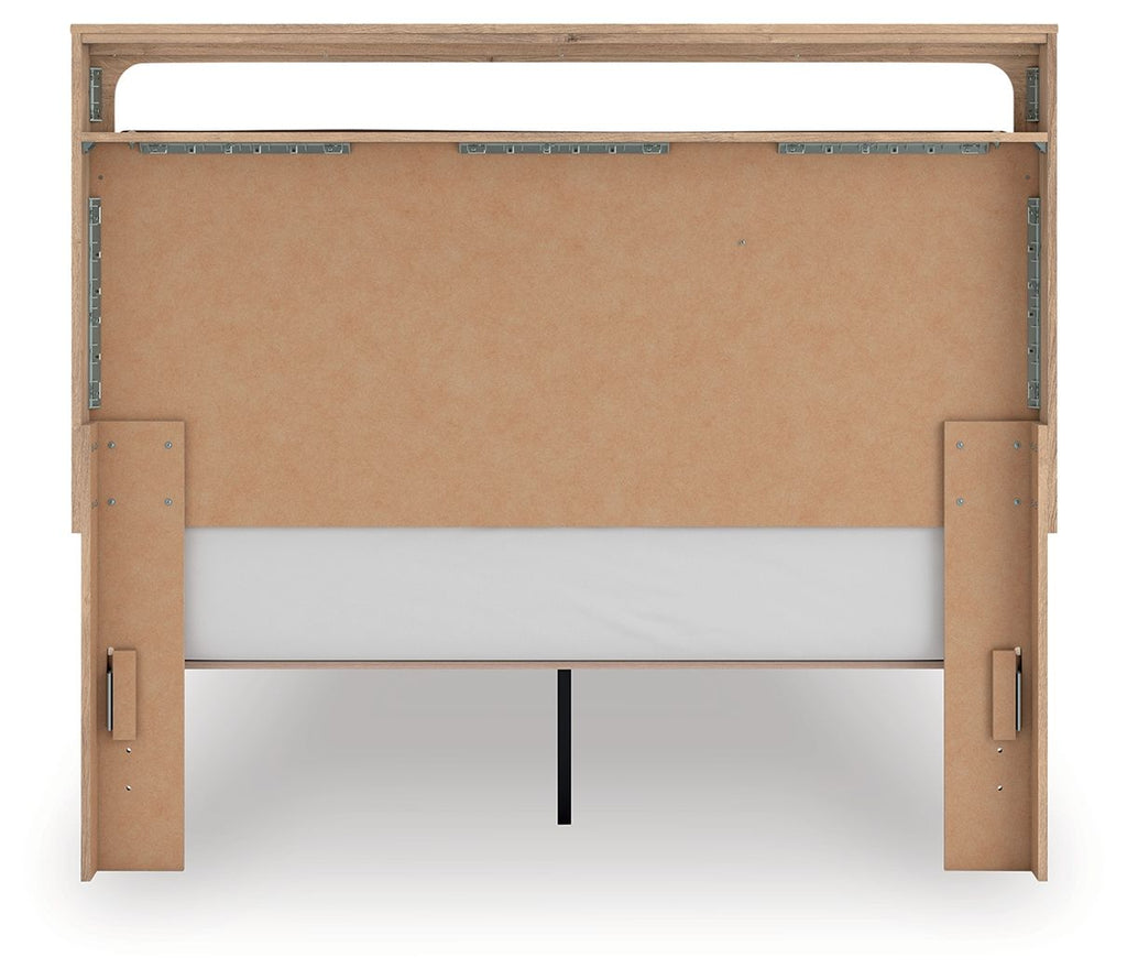 The natural wood tones and clean lines of this king upholstered platform bed echo your easygoing style sensibilities. With a warm finish and replicated oak grain, its carefree character lightens up your bedroom. Curved inner corner details soften the look, while contrasting brown fabric modernizes the feel. And for added function, warm LED lighting adds serene ambiance at the touch of a button.