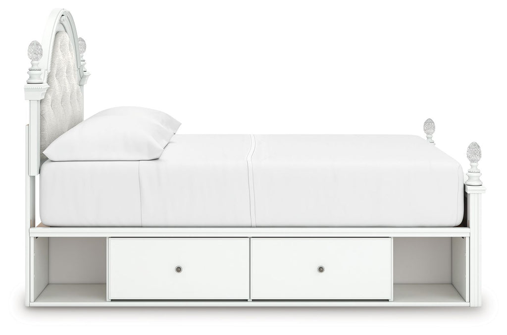 Fit for a princess. This upholstered panel storage bed’s crisp matte finish pairs with charming ornate beading details and sumptuous button-tufted upholstery—perfect for your girly girl. Spacious storage drawers neatly tuck away bedroom essentials, while decorative ball tops and multicolored LED lighting in the headboard are the crowning touches to make your little one feel like royalty.