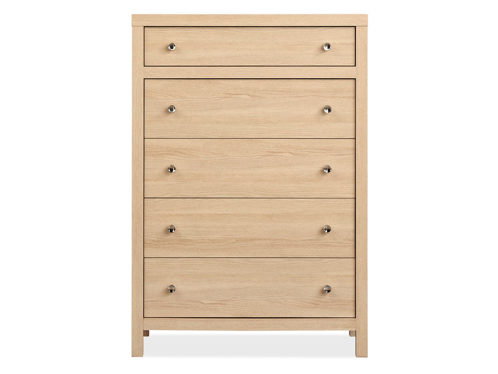 The Merrifield Collection boasts a bold finish and with rich undertones that mimic the texture of oak veneer and paired with sleek polished silver hardware to elevate its modern appeal. The casegoods feature minimalist lines and a sophisticated multi-dimensional finish and creating a clean and contemporary look that blends effortlessly into any modern bedroom. Perfect for contemporary interiors and the Merrifield Collection's combination of premium oak laminate and hardwood solids and and polished silver accents will transform your bedroom into a stylish and modern retreat.