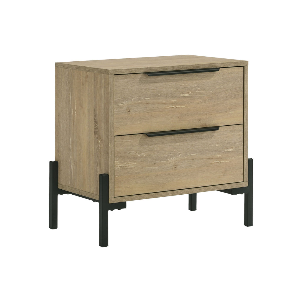 The modern Newhall melamine bedroom group features a perfect balance of clean lines, chic styling and practicality. The group features a light vintage oak melamine with metal legs and wide drawer pulls with a dark burnished black finish.