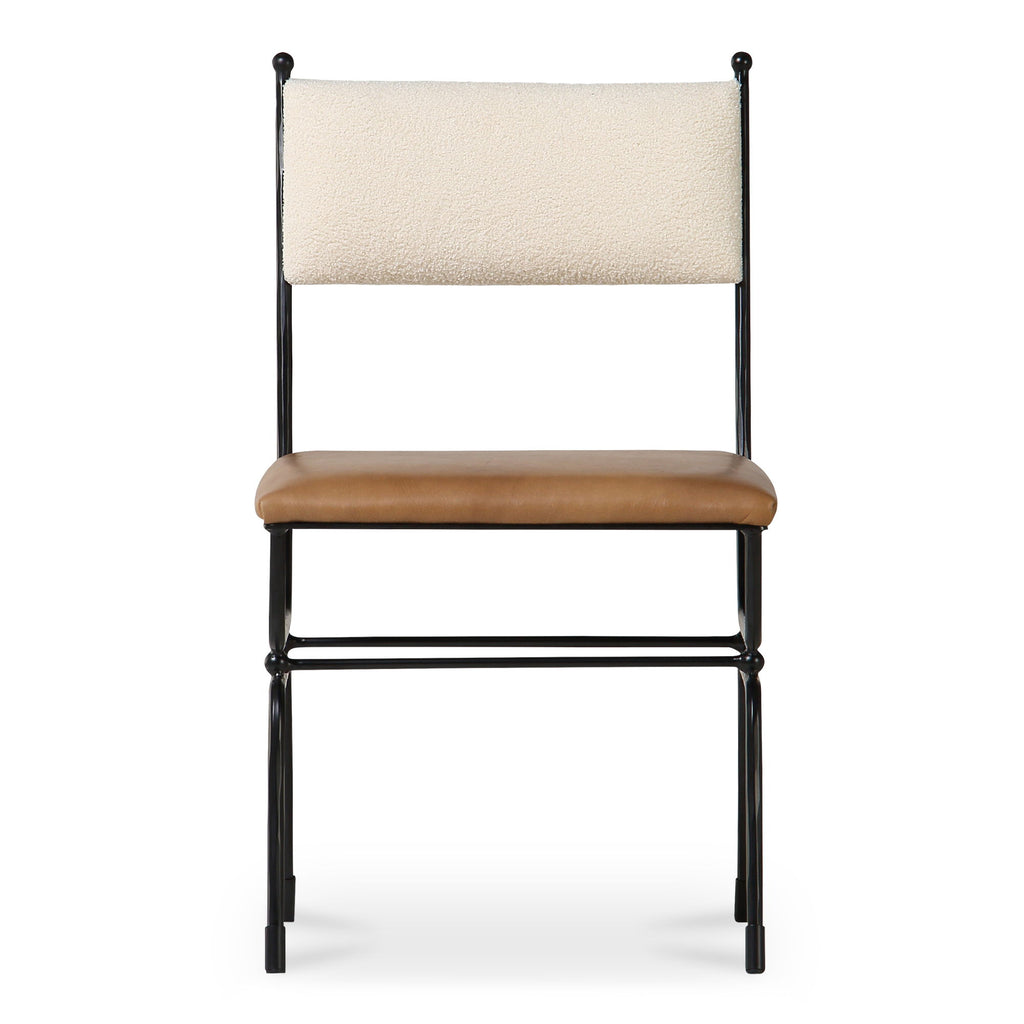 Gillian Segal for Moe's The Posta dining chair is inspired by the historical elegance of Italy's Posta Vecchia hotel, seamlessly marrying vintage allure with modern comfort. Its robust hammered metal frame underscores distinctive finial details on the back and base, echoing the Italian locale's enchanting spirit. Upholstered with top-grain brown leather seat and white textured fabric back, this piece adds plush comfort with a touch of Italian finesse.