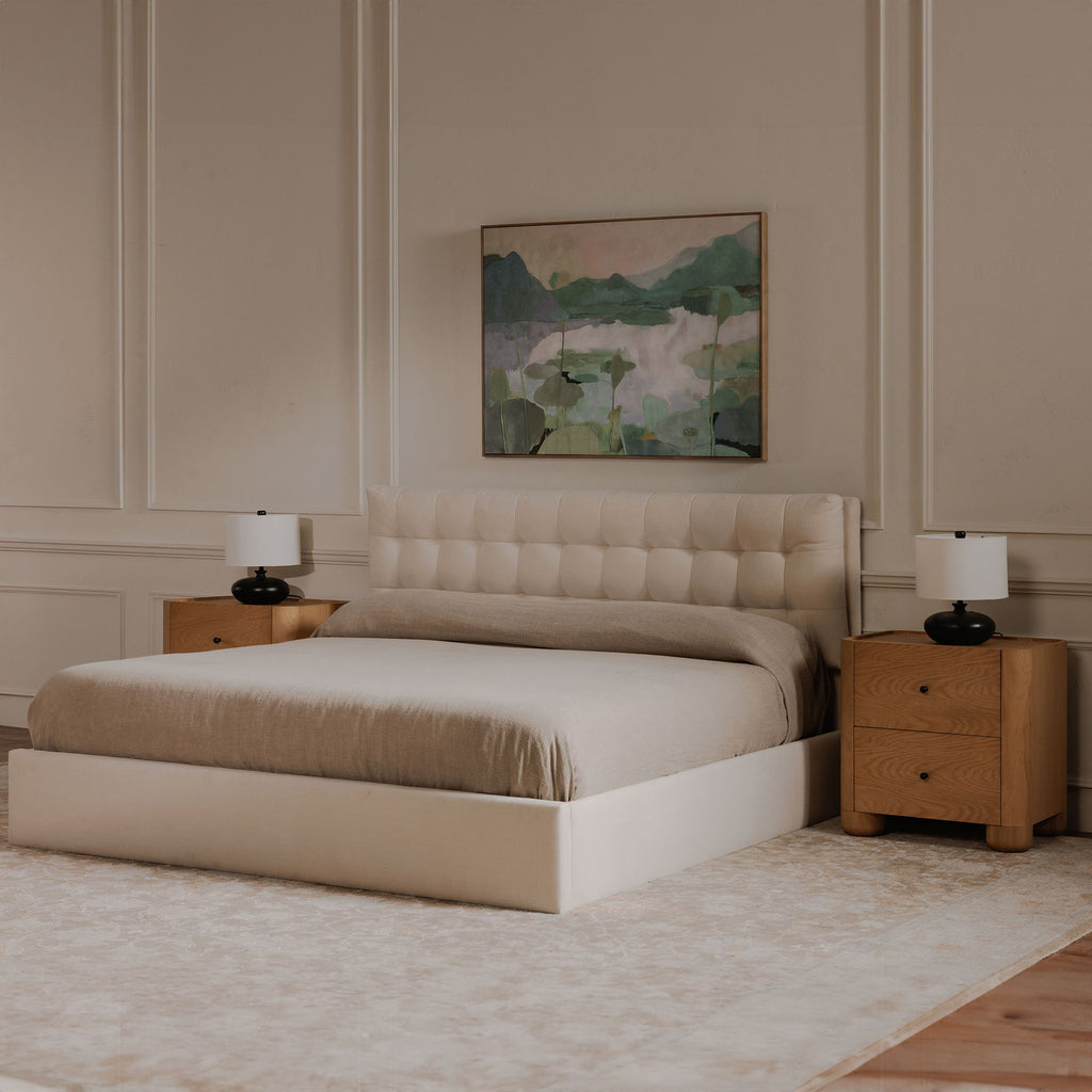 The Sebastion storage bed's double-layered headboard, featuring a tufted second layer and pillow-like front, creates a serene sanctuary. Crafted from solid wood, foam-filled, and upholstered in fabric upholstery, it promises enduring comfort. An innovative hydraulic lift system reveals discreet storage, seamlessly blending functionality with sophistication; every detail speaks to understated luxury and practical sensibilities.