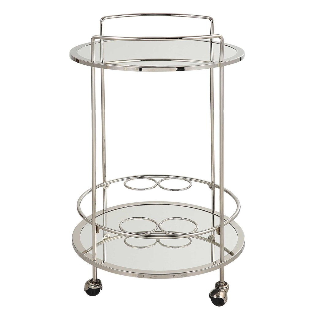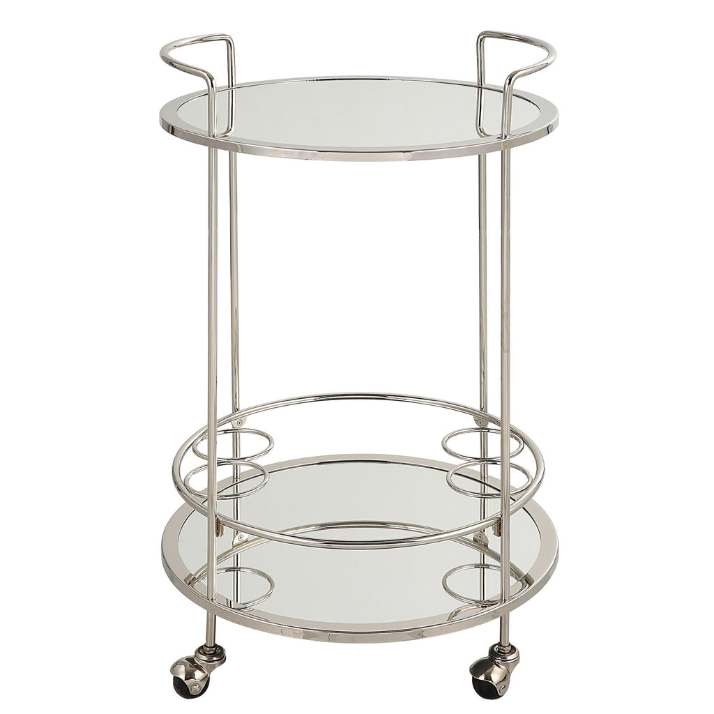 The Spritz Bar Cart Rolls Wherever The Party Goes! The Metal Cart Is Finished In Polished Chrome With Dual Mirrored Shelves For Optimal Storage And Display. The Petite Round Frame Sits Atop Rolling Casters, Enabling Easy Placement In Any Living Or Dining Space.