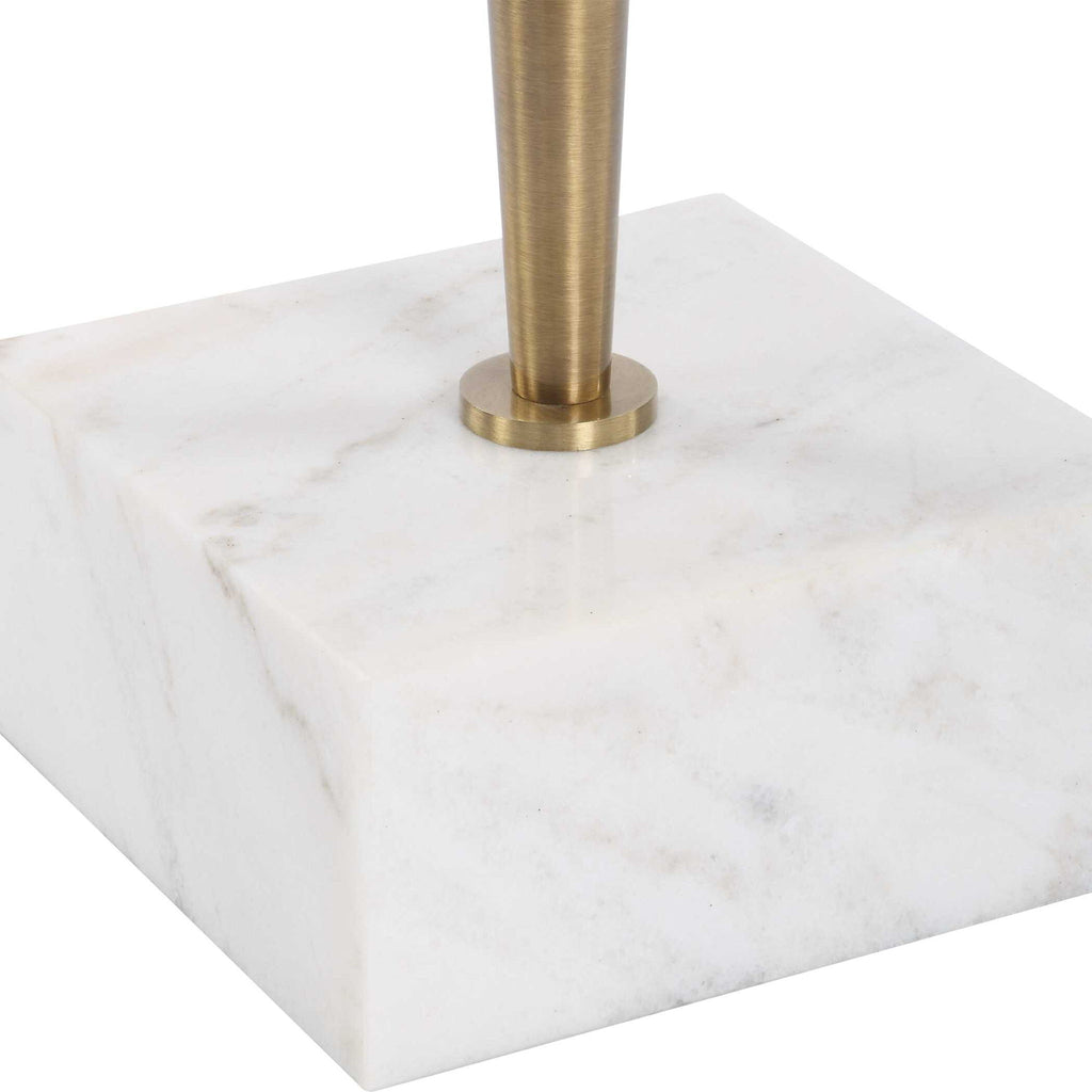 Showcasing Style And Sophistication, This Drink Table Features A Thick Crystal Top On A Tapered Stainless Steel Base Plated In Brushed Brass, Resting On A Natural White Marble Foot.