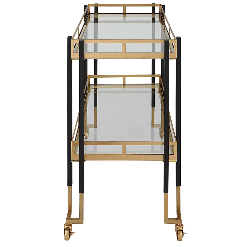 Featuring A Clean Lined Solid Iron Frame, This Contemporary Bar Cart Is Finished In A Two-toned Matte Black And Gold Leaf. Has Two Tempered Glass Shelves, Complete With Rolling And Locking Casters.